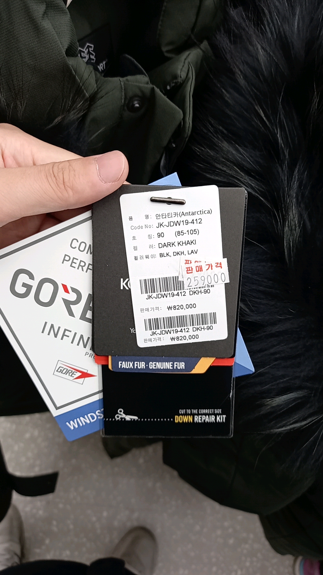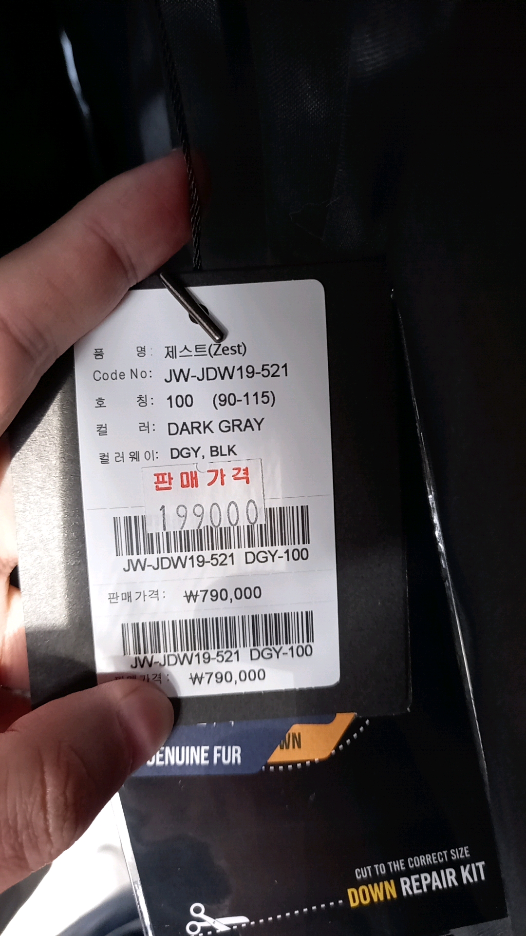 코오롱 스포츠 패딩을 구입하기 위해 남성복 코너를 둘러보았습니다. 코오롱 실퍼폭스 다운코트가 눈에 띄길래 살펴보았습니다. 택을 보니 품명은 zest제스트이고 원가가 790000원입니다. 후덜덜한 가격이네요. 그런데 세일해서 199000원에 판매되고 있습니다.