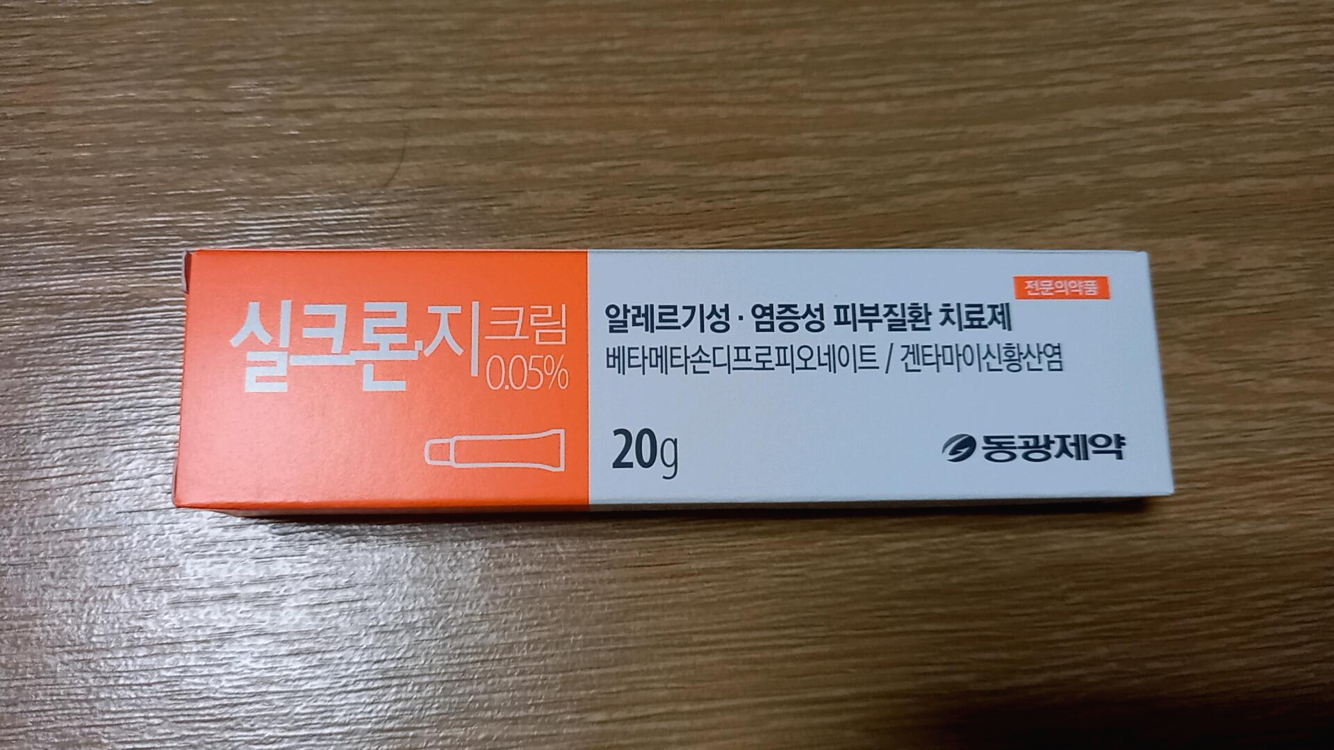 피부과에서 처방받은 연고입니다. 실크론지 크림인데 알레르기성 염증성 피부질환 치료제입니다. 스테로이드연고 같은데 베타메타손디프로피오네이트/겐타마이신황산염 20g이라고 써있네요.