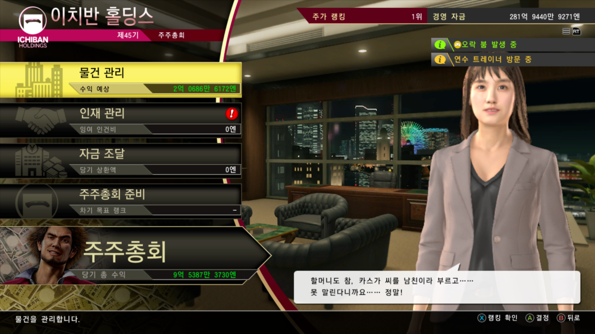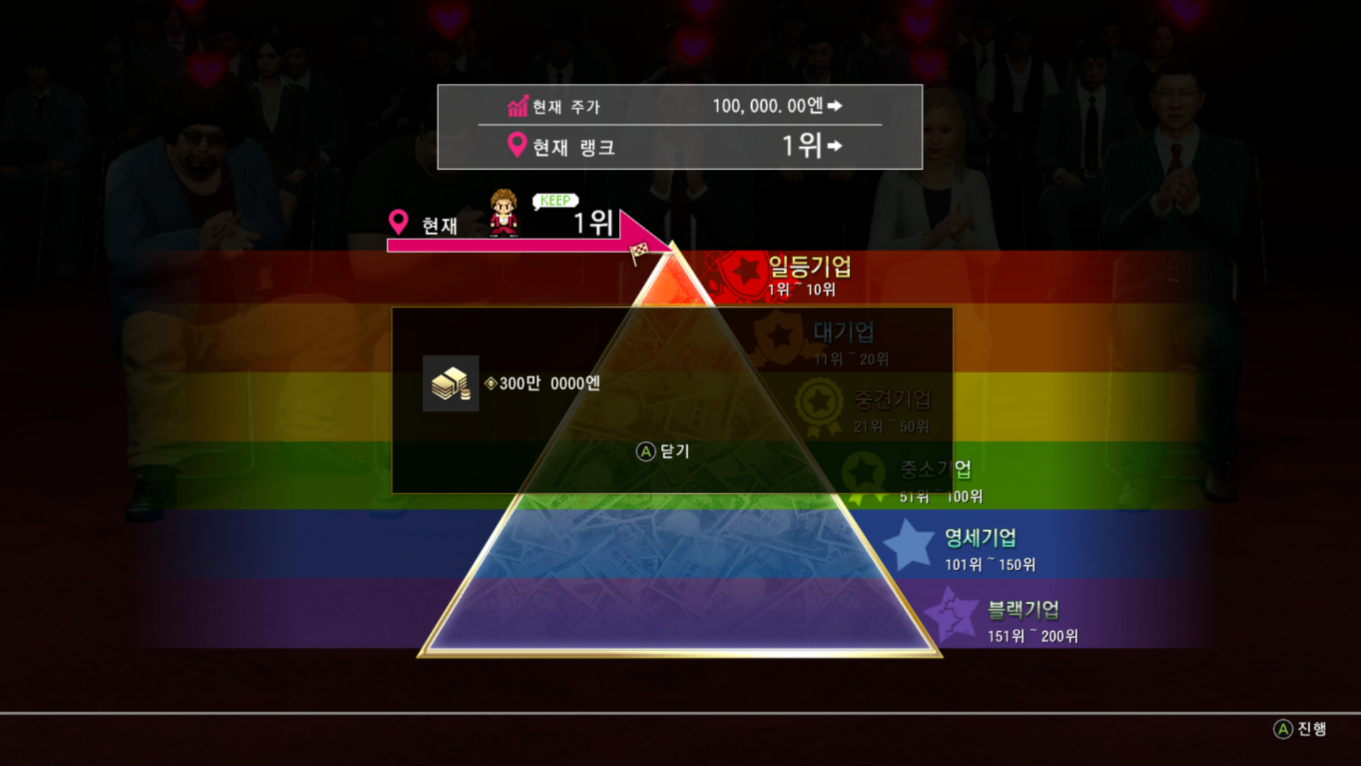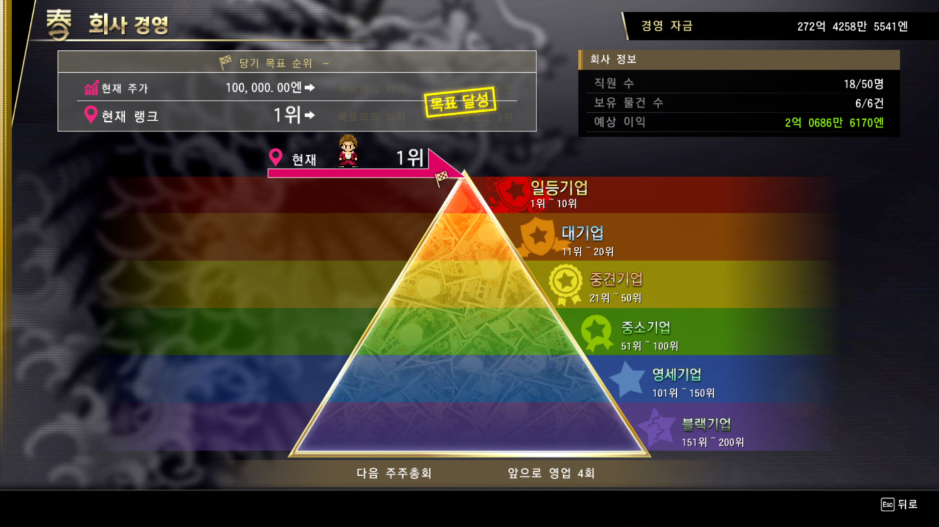 1위 랭크를 찍고 4회 경영을 하면 주주총회를 하게 됩니다. 그리고 주주총회에서 이기면 300만엔을 받게 됩니다.