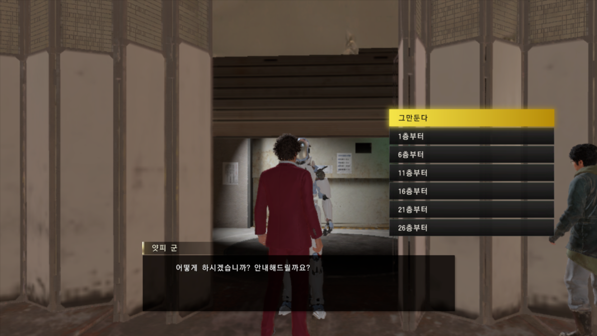 배틀 아레나 입구에 있는 안내로봇 얏피군입니다. 위에 찍은 스샷은 제가 배틀 아레나를 30층까지 완료하고 다시 방문한 모습입니다. 처음에 방문하면 그냥 들어가는데 30층까지 다 클리어하면 5층 단위로 맞춰서 들어갈 수 있습니다. 용과같이7 돈벌기, 돈버는법 노가다를 하려면 26층부터 들어가 30층까지 클리어하는 것을 반복해야 합니다.